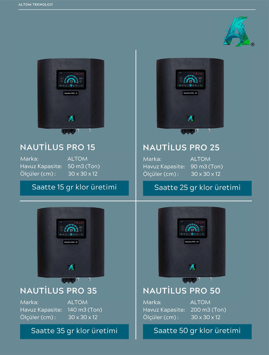 NAUTİLUS PRO AİLESİ 5 inç dokunmatik ekran Altom pH kontrol ekleme imkanı Altom ORP (Redox) kontrol ekleme imkanı Bipolar tuz hücresi tasarımı Kendi kendini temizleyen tuz hücresi Susuz çalışma önleyici Geri yıkama uyarı sistemi Düşük üretim uyarı sistemi Havuz pompası otomatik kontrol Havuz ışıkları otomatik kontrol Ekstra 2 adet otomatik kontrol Her otomatik kontrol için 2 farklı zamanlayıcı imkanı Çift dil desteği (Türkçe – İngilizce) 5000 saat ömürlü tuz hücresi Adresinizde servis